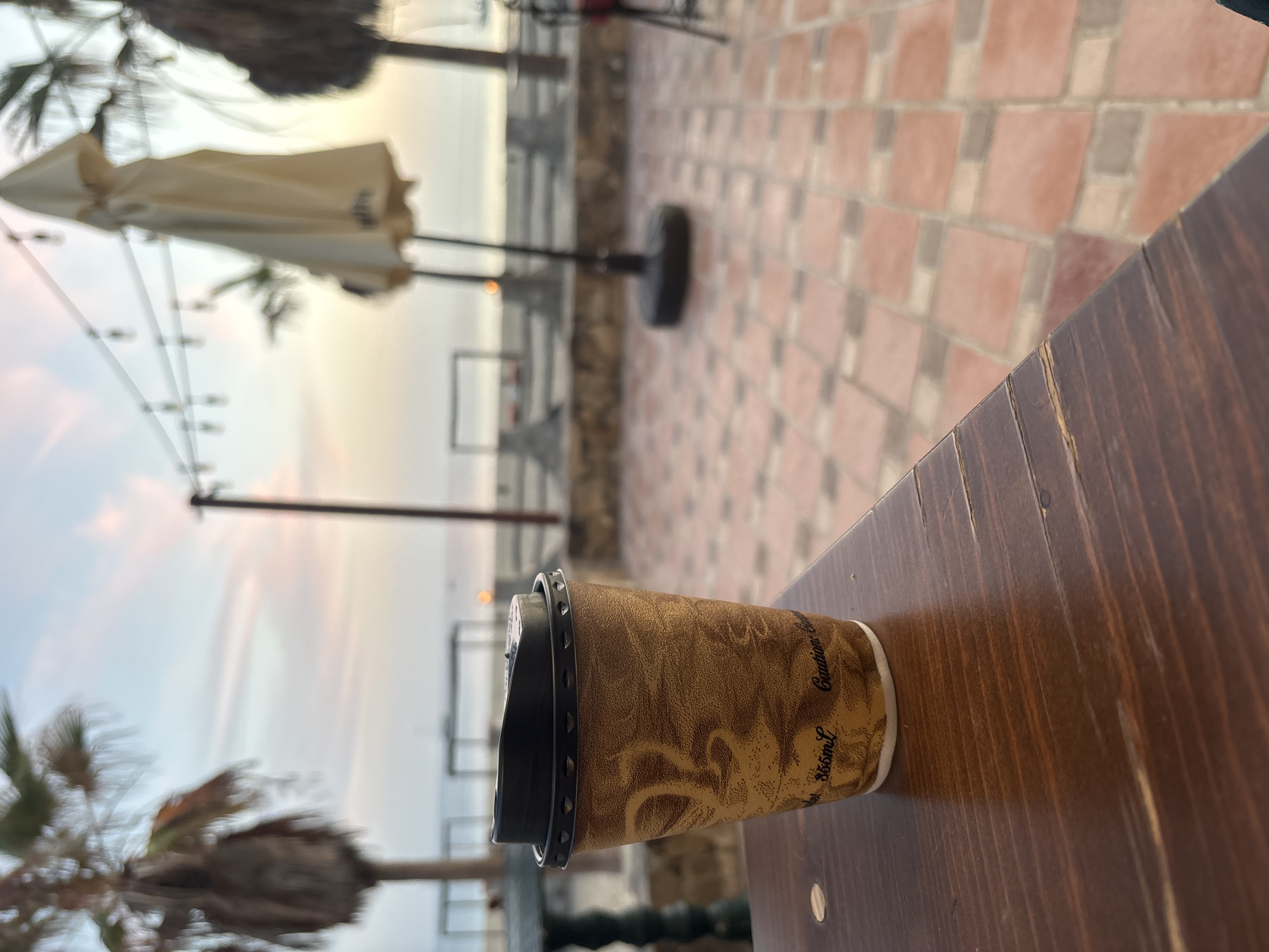 coffee cup sitting on a wooden table in an outdoor setting. In the background, the beach is visible, with palm trees and umbrellas lining the shore. The ground is paved with red bricks. The sky is light, suggesting it is either early morning or late evening. The cup is labeled with "Canadian Coffee," and a quantity marking (355ml). I can not determine whether or not this image was taken in Buenavista, Mexico.