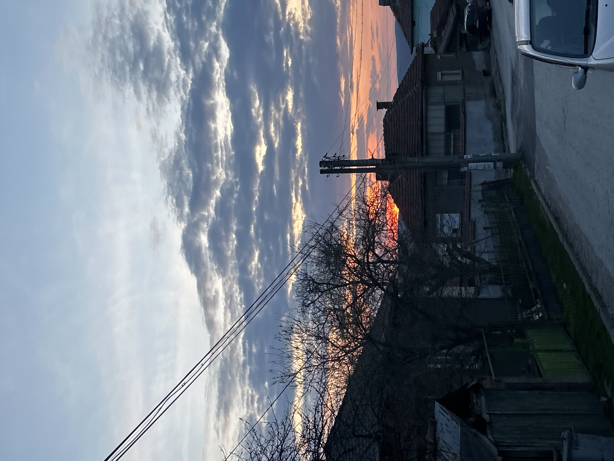The scene depicts a residential street in Cherven Bryag, Bulgaria, at dusk. The sky overhead transitions from light blue to a mix of dark gray, broken clouds, with a prominent band of orange and red light from the setting sun visible along the horizon, particularly on the left. Utility poles with multiple overhead wires traverse the frame. In the foreground, the upper portion of a silver or light-colored vehicle, possibly a hatchback or small SUV, is visible on the right. The road surface is gray, appearing to be paved asphalt or concrete, with a darker curb separating it from a narrow strip of grass on the left. On the left side of the street, a dark, weathered wooden fence is present, featuring a rectangular green metal gate. Behind this fence, several deciduous trees with bare branches are silhouetted against the bright sunset, indicating a late autumn, winter, or early spring season. A small, dark structure with a sloped roof is also partially visible behind the fence. The midground features several residential buildings with distinct red-tiled roofs. One prominent house in the center-right has an unpainted or light gray facade, with a large, weathered shutter or covering over an upper-story window. Another utility pole stands in front of this house, featuring multiple wires and cross arms. Further down the street on the right, a dark-colored SUV or van is parked. The distant background reveals silhouetted hills or undulating terrain under the colorful sky. No people are visible within the frame.