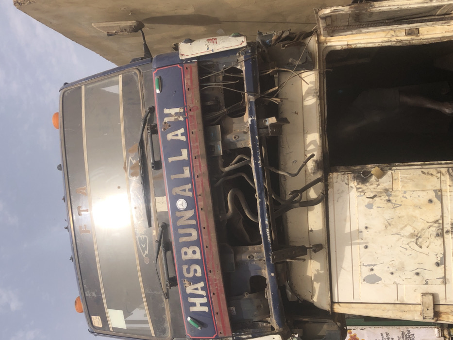 - "A damaged, blue and white heavy-duty truck cab is depicted head-on, positioned next to a light-brown wall under a bright, hazy sky in Tukur Tukur, Nigeria" by FM-IhhyI2, licensed under CC BY 4.0