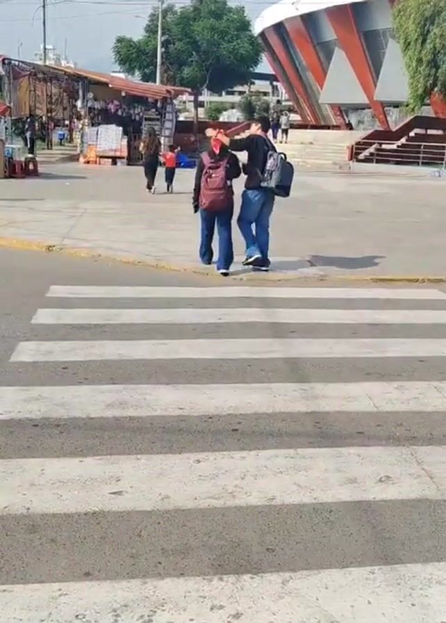 crosswalk scene. Two taxis cross the crosswalk. A man is visible hanging his arm out of the window of the first taxi. The license plate number of the first taxi is T6F-694. Both cars are dark colored. Two pedestrians walk across the crosswalk. There are market stalls to the left of the crosswalk. A large, modern building is visible in the background.