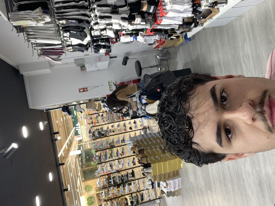 The scene depicts the interior of a retail establishment in Mirandela, Portugal, featuring an apparent shoe store and an accessories section. In the immediate foreground, the upper half of a male individual's face is visible, characterized by dark, curly hair, pronounced eyebrows, and a mustache, facing directly towards the viewer, indicative of a self-portrait. To the left, beyond the foreground individual, a shoe retail area is visible through an open archway. Multiple tiered display racks showcase various models of footwear, primarily sneakers. Stacks of shoeboxes are arranged on the light grey floor. A green and white sign displaying "Wells" is partially visible above the shoe section, suggesting the store's affiliation or proximity. In the center-right of the frame, a female individual with long, dark hair, wearing a tan long-sleeved shirt and blue jeans, stands behind a dark counter. She is actively engaged in handling or organizing textile items, some of which are contained within a black bag. A black, adjustable ergonomic stool is positioned near her workstation. The right wall features extensive vertical displays holding numerous packaged socks and small textile accessories on hooks, with brands such as "Vans" and "Fila" discernible on some packaging. Beneath these displays, various product boxes are stacked. The ceiling is black, equipped with multiple recessed circular lights and linear strip lighting. A surveillance camera is mounted on the ceiling. A red fire extinguisher and a grey electrical utility box are affixed to a white wall in the mid-ground. The floor throughout the visible area is a consistent light grey.