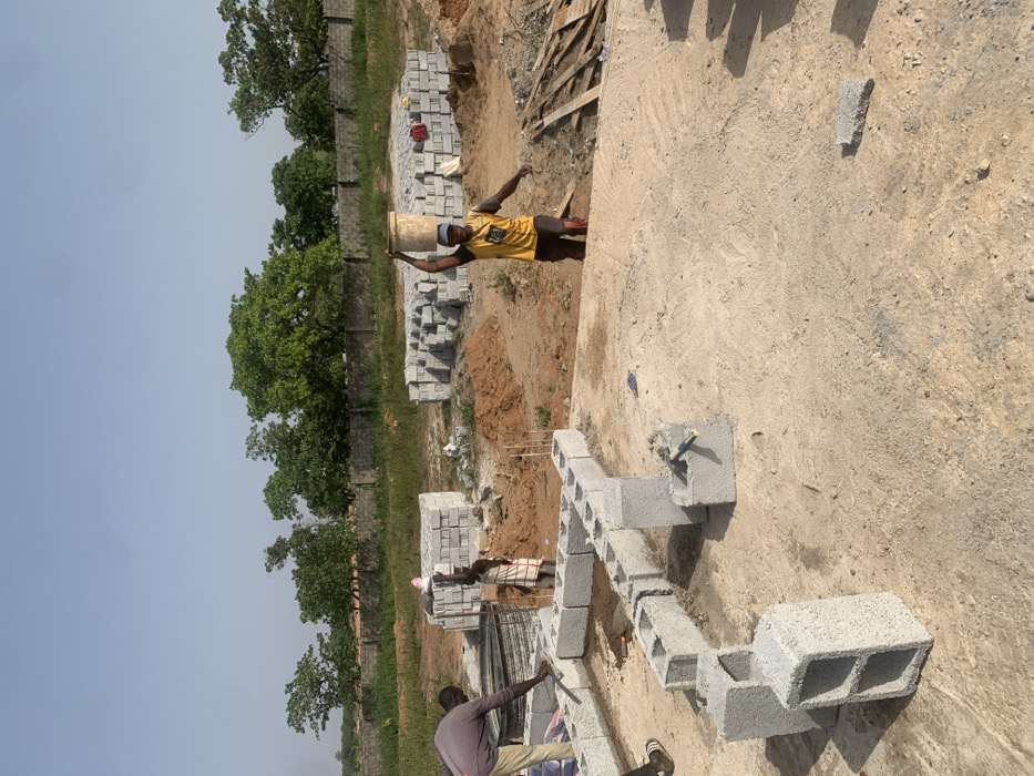The image depicts a construction site in Karsana 2, Nigeria, under a clear, bright sky