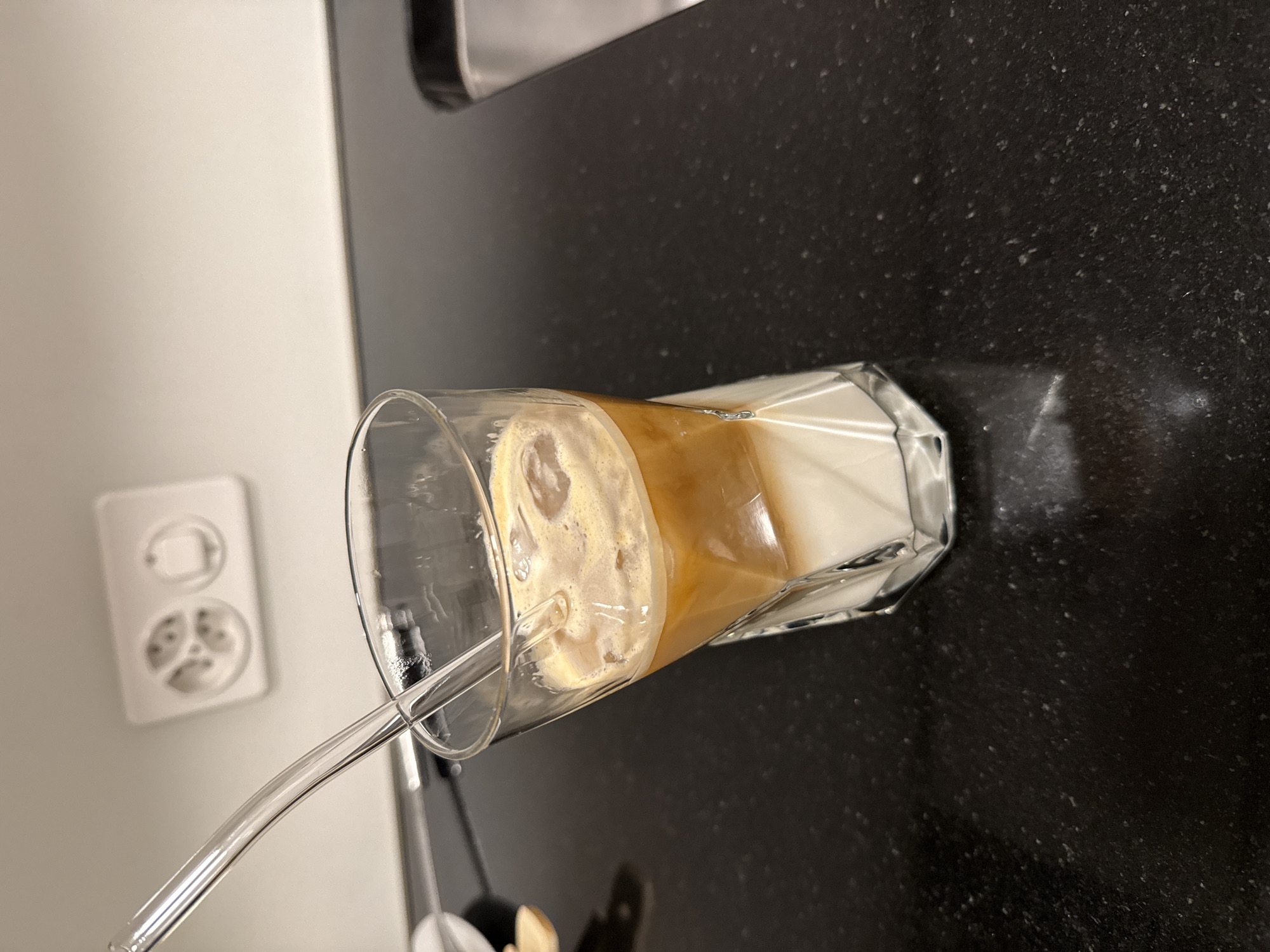 - "A faceted glass containing a layered iced coffee beverage with a clear bent straw is positioned on a dark, speckled countertop" by FM-kqPBT2, licensed under CC BY 4.0