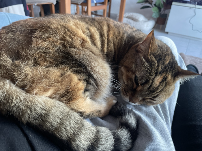 - "A tabby cat with brown and black stripes is curled up and sleeping on a person's lap" by FM-T5EOT2, licensed under CC BY 4.0