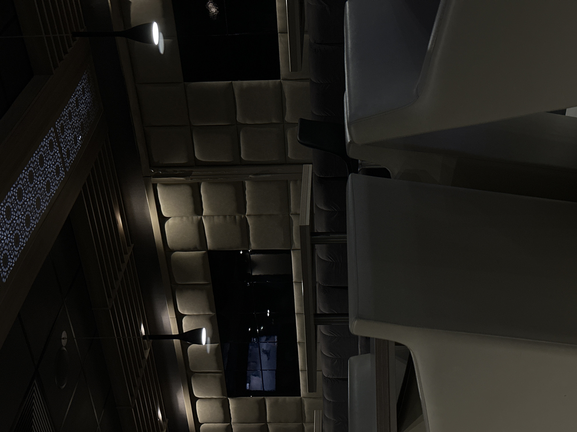 The image displays the interior of a modern, dimly lit commercial establishment, such as a restaurant or lounge, entirely devoid of people
