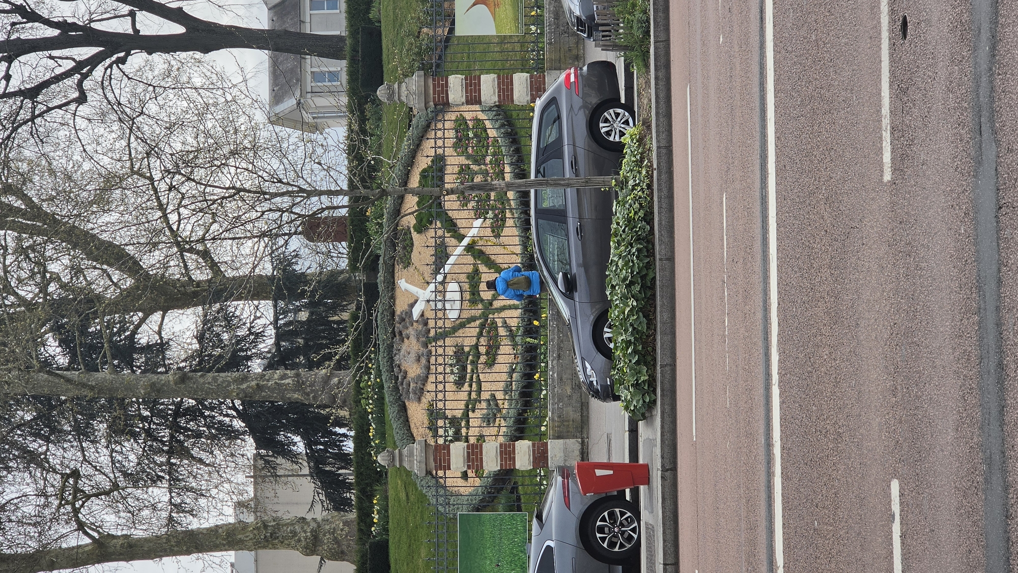 The image depicts an outdoor scene in Versailles, France, specifically at the Horloge Florale (Floral Clock) located on Avenue de Paris, near Place d'Armes. The scene, captured under an overcast sky, features a large, circular floral clock approximately 10-15 meters in diameter, situated on a gentle grassy incline. The clock face comprises a pattern of light-colored gravel, various low-lying plants, and small clusters of yellow flowers. A prominent white 'W' motif, along with two white clock hands, is centrally displayed on the clock face. A black metal fence, interspersed with decorative brick and stone pillars, encloses the floral clock. Beyond the clock, deciduous trees with sparse foliage and light-colored buildings with grey roofs are visible in the background. In the midground, a single individual, viewed from behind, stands directly in front of the floral clock's fence. They are wearing a blue hooded jacket and a green backpack. On the paved sidewalk in the foreground, two vehicles are parked parallel to the street. On the left, the rear of a grey sedan with multi-spoke wheels is visible. To its right, a dark grey station wagon is parked. A red pillar-shaped object, consistent with a post box or utility cabinet, stands on the sidewalk between the two vehicles. A strip of green ground cover separates the sidewalk from a reddish-brown asphalt road featuring white lane markings.