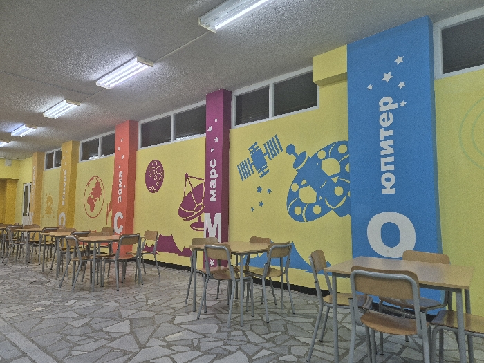 An empty interior room, likely a cafeteria or common area, is depicted with a brightly decorated theme