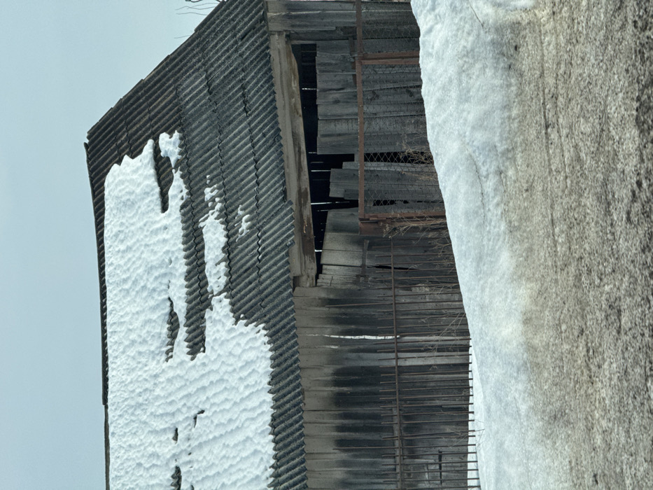 An outdoor scene in Кварса, Russia, depicts a weathered, single-story wooden structure, likely a barn or shed, under an overcast sky. The building features a dark, corrugated roof partially covered by uneven patches of white snow. Its walls are constructed from vertical, aged, dark wooden planks, with a large, unsealed opening in the center front revealing additional internal wooden elements. A rusty, low-slung metal fence, composed of vertical bars, stands directly in front of the wooden structure. The foreground is dominated by a snowdrift, its surface exhibiting areas of melting and dirt, sloping upwards from the bottom of the frame towards the fence line. No individuals or active subjects are present.