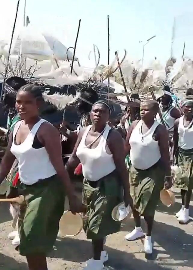A group of women, and some men, are walking in a procession outside. They are wearing white tank tops, green skirts, and white sneakers. The women carry small bowls and the men carry spears. Some have white feathers in their hair and beaded headbands. There is a vehicle behind them with white feathers and decorative items on it. The sky is blue.