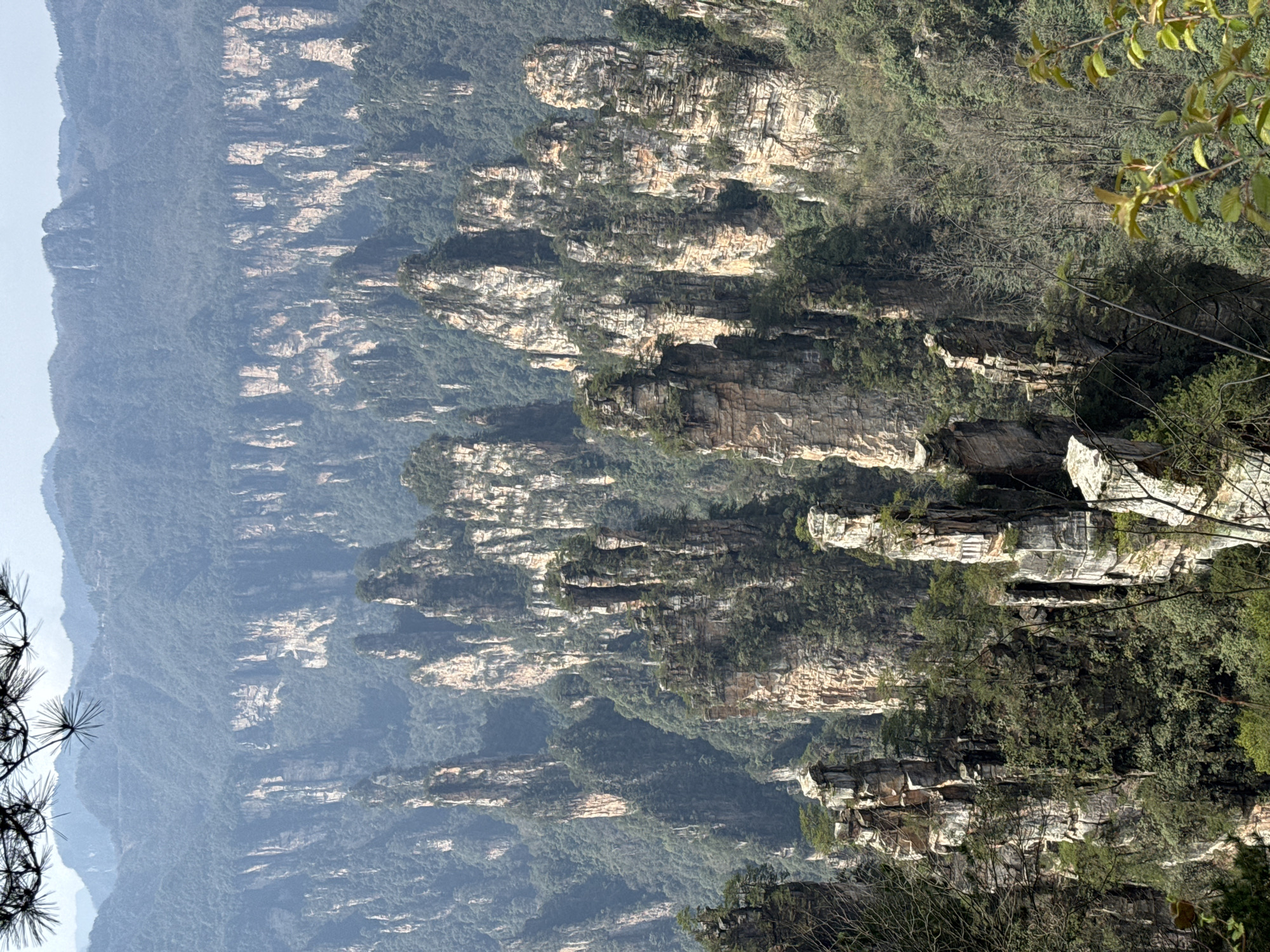 The image displays a panoramic view of the Wulingyuan Scenic Area in Wulingyuan, China, characterized by a vast array of towering, vertically eroded sandstone pillars. These geological formations dominate the midground and background, varying in height and width, exhibiting light brown to gray coloration with visible stratification. Dense green vegetation, including trees and shrubs, covers the tops and ledges of many pillars, as well as filling the valleys and slopes between them. In the immediate foreground, out-of-focus branches with dark green pine needles are visible in the upper left, while blurred green leaves appear in the lower right, framing the central landscape. The background reveals successive layers of progressively hazier, forest-covered mountain ranges extending towards the horizon under a light blue or pale gray sky, indicating atmospheric haze. No people, man-made structures, or direct signs of human activity are present. The scene is static, illuminated by natural daylight.