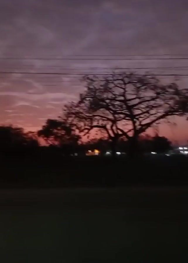dark landscape during dusk or dawn. The sky is a blend of dark purple and fading pink colors with clouds covering most of the visible area. Silhouettes of trees and sparse structures are visible against the colorful sky. There are a few blurry lights in the distance, possibly from buildings or streetlights. A dark, indistinct shape of a car can be seen briefly at the beginning of the video. The camera appears to be moving horizontally, possibly from inside a vehicle.