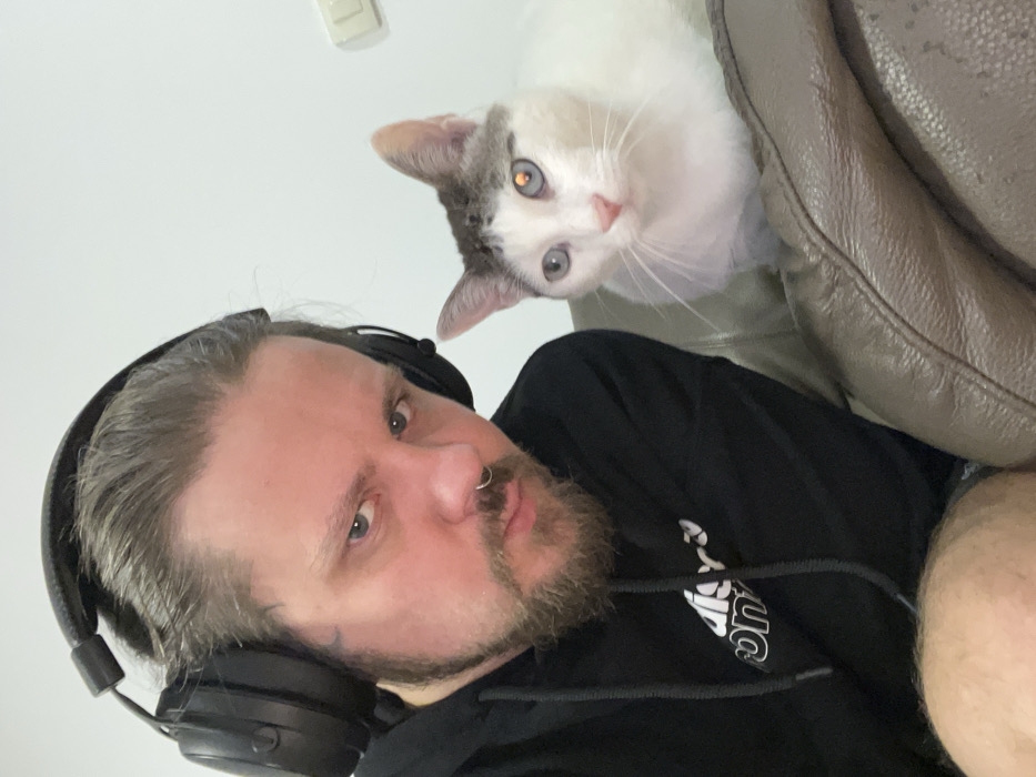 The scene is set indoors in Boreti, Montenegro. An adult male is positioned on the left side of the frame, visible from the chest up. He has a beard, a nose ring, and dark hair pulled back, wearing black over-ear headphones and a black hooded sweatshirt with a white graphic. His gaze is directed towards the camera. To his right, a cat is situated on a light brown leather couch. The cat is white with grey patches on its head; its right eye is blue, and its left eye displays a golden hue with a visible light reflection. The cat also appears to be looking towards the camera. A section of the male's bare leg is visible at the bottom left. The background consists of a plain white wall, with a white light switch or outlet positioned in the upper right quadrant.