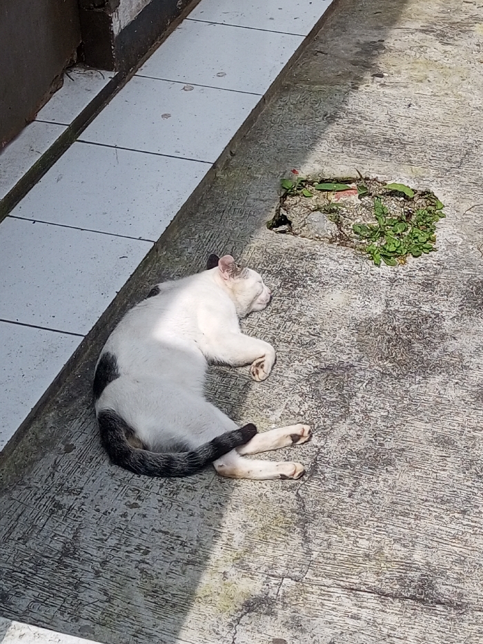 - "A white cat with black markings on its back and a dark, possibly striped tail, lies asleep on its left side on a textured concrete surface" by FM-AX1Wz1, licensed under CC BY 4.0