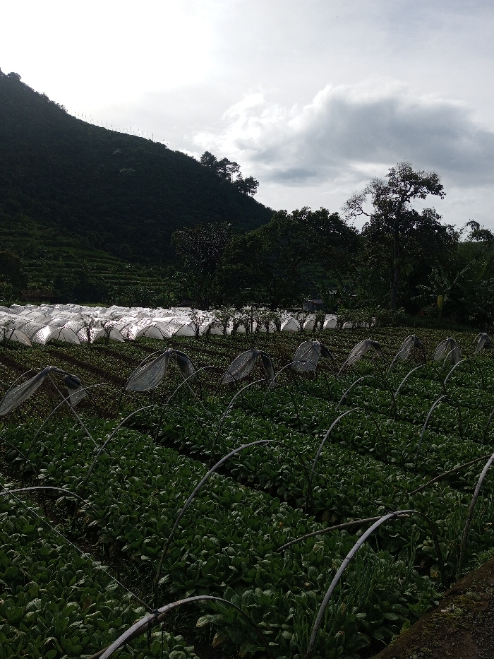 The image displays an agricultural landscape located in Salai Har Htan, Myanmar, under an overcast sky with bright sunlight breaking through from the upper left. A steep, densely vegetated hillside occupies the background, exhibiting visible terraced farming on its lower slopes and scattered trees higher up. In the midground, numerous elongated, tunnel-shaped greenhouses constructed with white translucent plastic covers are arranged in parallel rows. In front of these, several rows of cultivated green plants are visible, many protected by smaller, individual hoop structures, some partially covered with translucent material, while others remain uncovered. The foreground is dominated by dense rows of uniform green leafy plants, likely a vegetable crop, growing in beds and also featuring small, exposed hoop frames. No individuals or active interactions are depicted. A dark, possibly moss-covered, structural edge is present in the lower right corner.