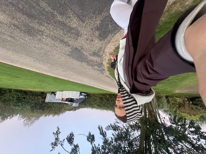 The image depicts an outdoor scene within a caravan park setting in the Weymouth area, United Kingdom, during twilight hours, characterized by a soft, diffused light and a pale pink tint in the upper sky. In the foreground, a paved, dark grey pathway or road, exhibiting a granular texture, extends diagonally from the lower left towards the upper right. A single individual, appearing to be female, is positioned in the left foreground, captured in a selfie-style perspective with the camera held by an extended left arm. Her head is turned to the right, directing her gaze away from the camera. She wears a dark, likely maroon, long-sleeved jacket open over a light grey hooded sweatshirt. A black and white horizontally striped hood covers her head, layered over the grey hoodie's hood. Light grey sweatpants are visible on her lower body. A red band is present on her left wrist. To the left of the pathway, a large deciduous tree with green foliage and smaller shrubs are visible. To the right of the pathway, a well-maintained green grass pitch stretches, bordered by dense green hedges that form the background. Parked on this grass pitch is a dark-colored camper van with its pop-top roof in an extended, raised position. Adjacent to the camper van, a white, slatted windbreak or privacy screen is erected. Partially visible behind the windbreak and camper van is a small, silver-grey enclosed utility or cargo trailer. The overall environment suggests a recreational camping or touring site.