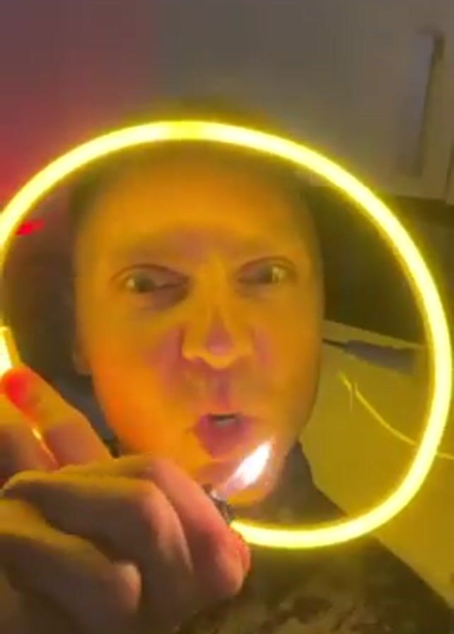 A man with short blonde hair and light eyes is seen in a close-up selfie. He holds a ring-shaped yellow neon light around his face. He makes a surprised facial expression, then sticks his tongue out while igniting a lighter. He then smiles, extinguishes the lighter, and holds up his hand, removing the neon ring. He smiles into the camera and is standing indoors in a kitchen-like area. Red and other yellow neon lights illuminate the space. There are various kitchen items visible in the background.