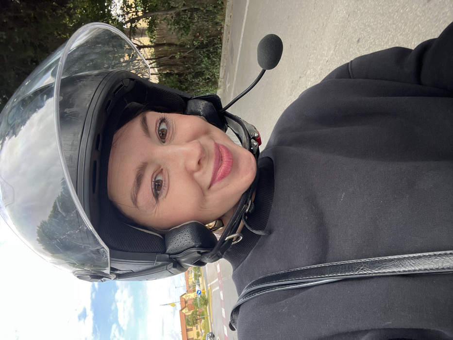 The image captures a close-up, eye-level view of a female subject, approximately 25-35 years old, positioned outdoors on a paved road in Castiglione della Pescaia, Italy. She wears a black open-face motorcycle helmet with a clear visor in a raised position, revealing her face. The helmet is equipped with a fastened chin strap and an integrated communication system featuring a microphone boom extending towards her mouth. She has light skin, brown eyes, and light brown hair partially visible beneath the helmet, and is smiling directly at the camera with light pink lipstick on. She wears gold-colored hoop earrings and a plain black long-sleeved top. A black shoulder bag with a textured strap is visible over her left shoulder. The background shows an urban environment. To the subject's left, a paved road features white markings and leads to a small roundabout with a central island containing green foliage. Beyond the roundabout, light-colored buildings with terracotta roofs and a yellow flag on a pole are visible. A vehicle is partially discernible in the distance. The sky is partly cloudy. To the subject's right, a dense line of green trees and bushes borders the road.