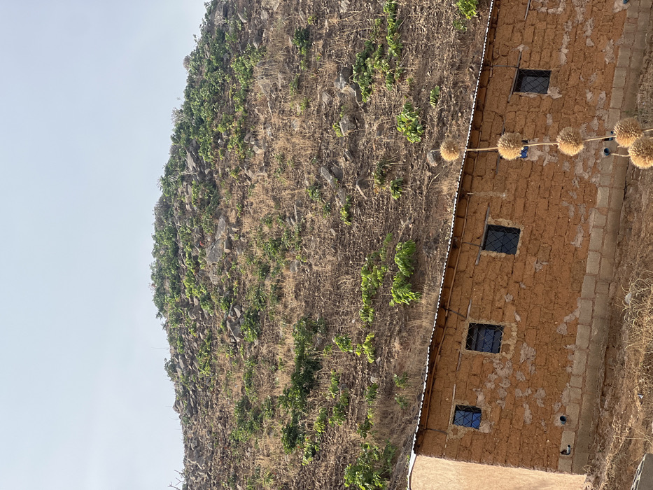 A rugged, rocky hill covered in sparse vegetation rises next to a simple, earthen building with four small, dark-framed windows