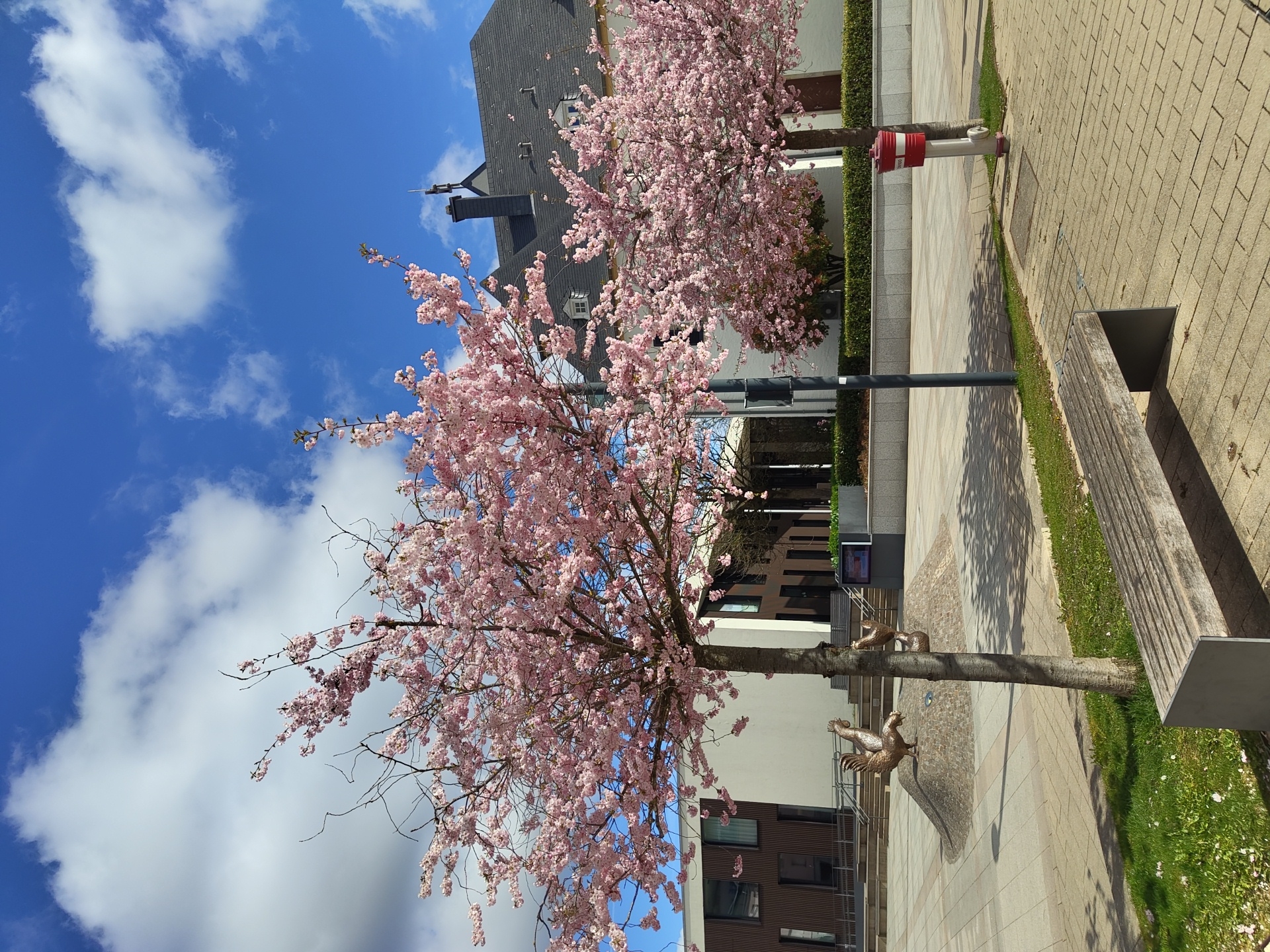 The image displays a public plaza in Bertrange, Luxembourg, under bright daylight with a clear blue sky and scattered white cumulus clouds. The foreground features a light-colored wooden slatted bench with dark grey supports positioned on a beige paved surface. Adjacent to the bench and around the base of the prominent trees are strips of green grass, with scattered pink petals visible on both the grass and paving. Dominating the mid-ground are two flowering cherry trees with grey trunks, densely covered in light pink blossoms. The tree on the left is positioned centrally, and behind it, a raised circular mound covered in dark cobblestones features at least three bronze sculptures resembling poultry (roosters and hens). To the right of the central tree, a dark grey utility pole stands, and further right, a red and white striped fire hydrant is visible. In the background, two distinct architectural structures are present. To the left, a modern building with white and dark brown paneling, featuring multiple rectangular windows and a visible railing system leading to an entrance, is partially obscured by the left cherry tree. To the right, a larger, more traditional building with white walls, a steep dark grey tiled roof, several dormer windows, a prominent dark chimney, and a small spire on its apex is visible. Strong sunlight casts distinct shadows from the trees and objects onto the paved surfaces. No individuals are depicted in the scene.