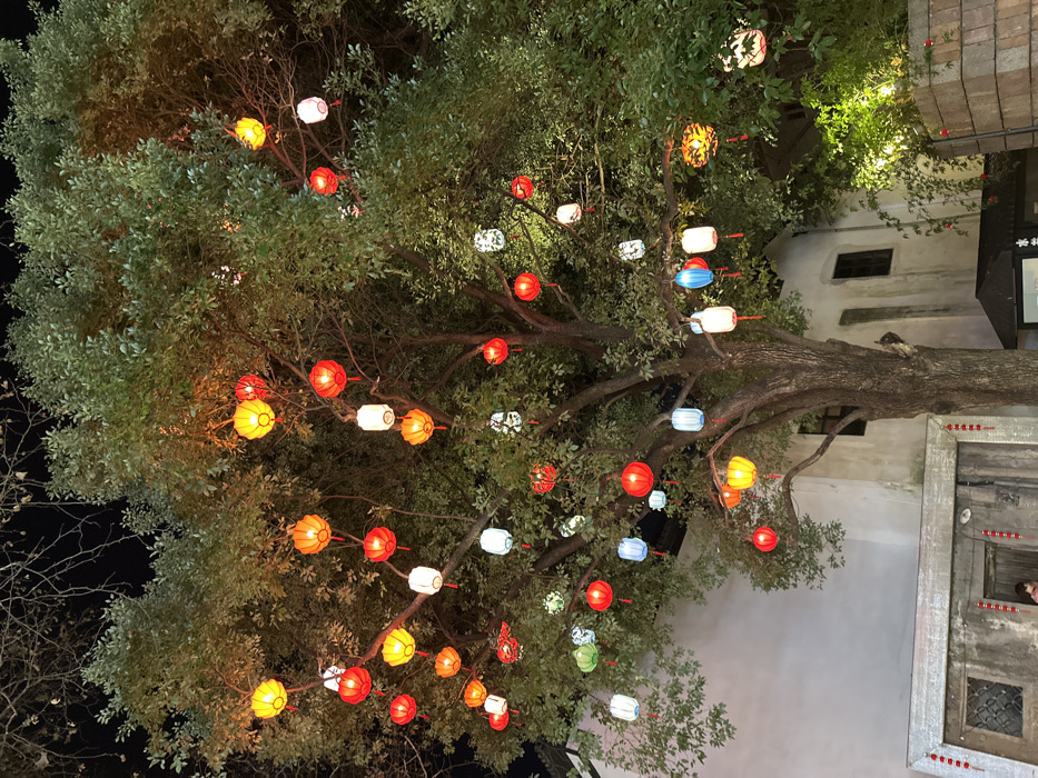 The image captures an outdoor nighttime scene within Shangcheng District, China. A prominent, large tree with dense green foliage fills the central and upper portions of the frame. Approximately 60-70 illuminated lanterns, varying in color (predominantly red, orange, yellow, white, and blue) and some featuring intricate patterns, are suspended from its branches. In the background to the left, a traditional building with light-colored walls and dark rectangular windows is visible. A weathered wooden door frame, decorated with multiple red tassels, is present in the lower-left. A single individual, partially visible from the upper chest upward with dark hair, stands near the base of this door frame. Additional building structures and illuminated green foliage are discernible on the right side of the scene.