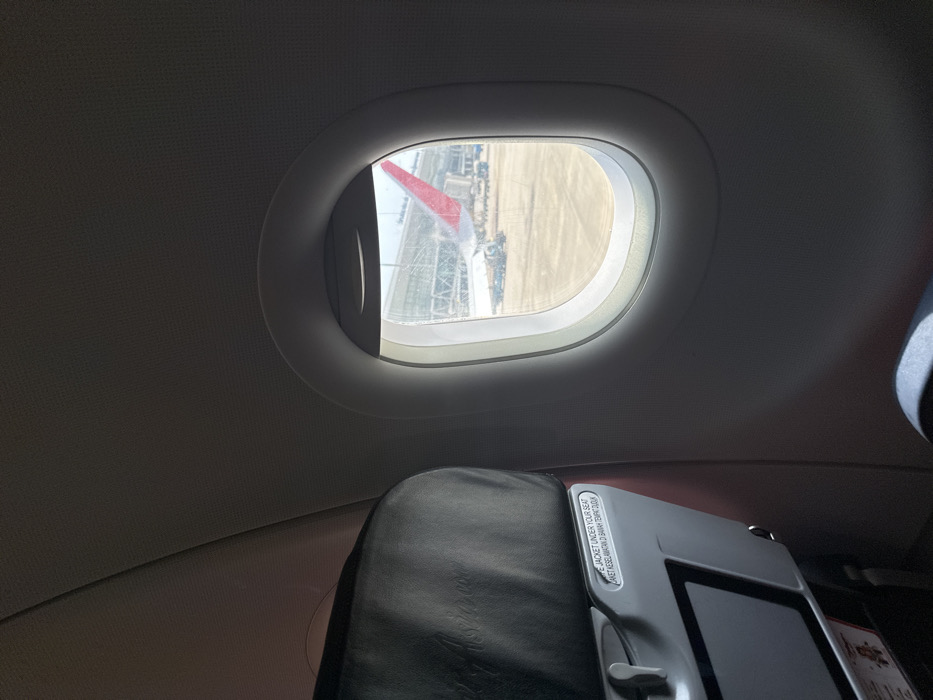 - "An airplane window view reveals a red wingtip and a tarmac with ground support equipment under a bright sky" by FM-P0ePn2, licensed under CC BY 4.0