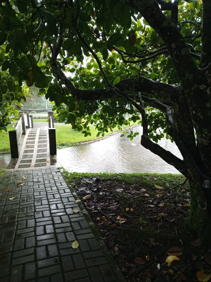 A gray-brick path leads to a small bridge over a stream. Water flows under the bridge and spreads into a wider area. Lush green grass lines the stream's edge. A large tree with thick branches and green leaves leans over the path and stream. The ground beneath the tree is covered with fallen leaves and debris, adding to the natural, slightly unkempt aesthetic.