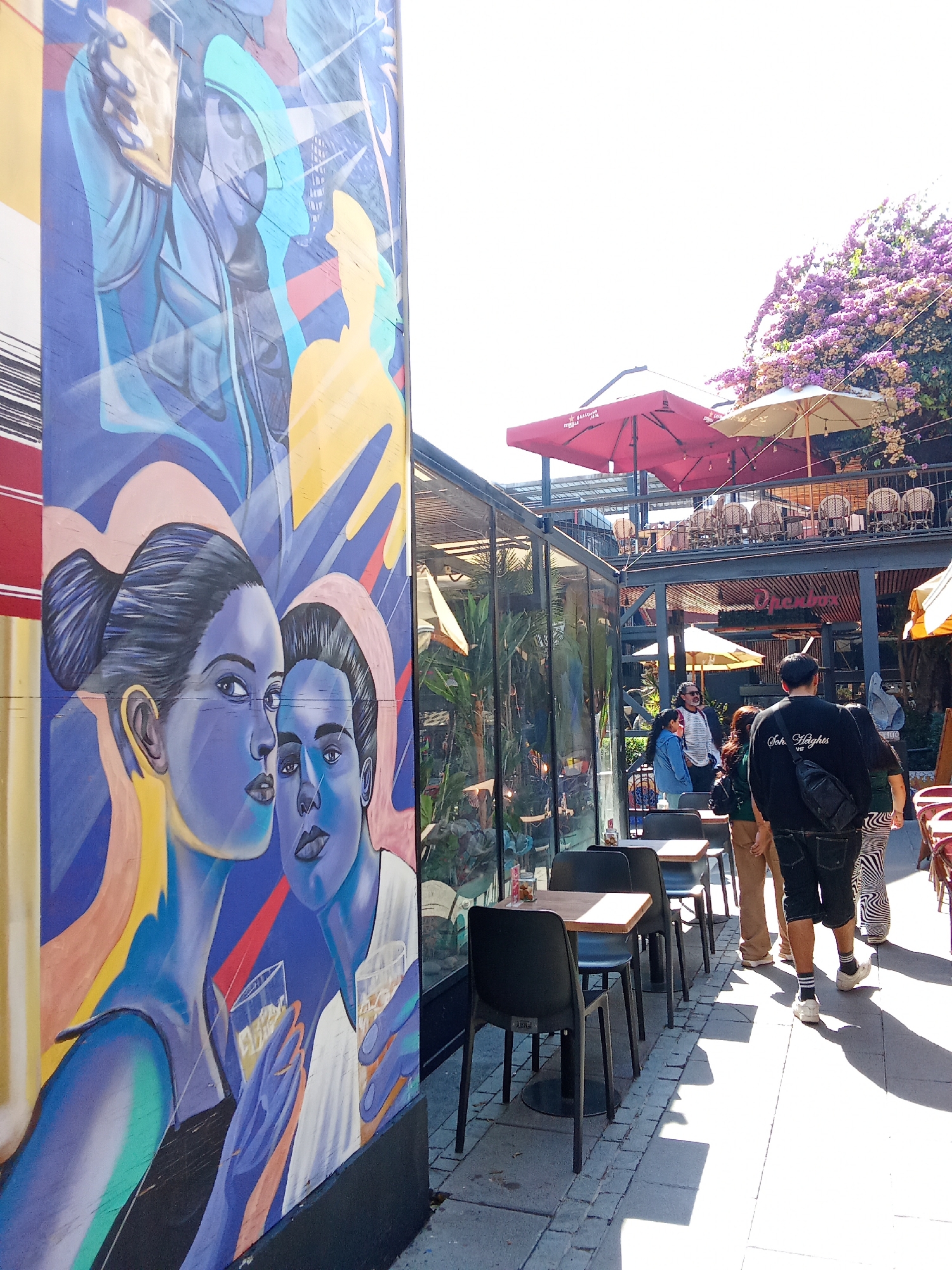 n outdoor scene in Providencia, Chile. On the left, a mural depicts stylized figures in blue hues, holding glasses and appearing to celebrate. To the right, an open-air restaurant patio is visible, with tables and black chairs lining a cobblestone walkway. Several people are walking along the path, including a person in a black jacket with white lettering on the back, brown pants, and white sneakers. Another person is wearing zebra-striped pants. In the background, there's a multi-level structure with outdoor seating under red and beige umbrellas. A large flowering tree with purple blossoms is also visible. The sun casts shadows along the walkway. The restaurant sign displays the name "Openbox."