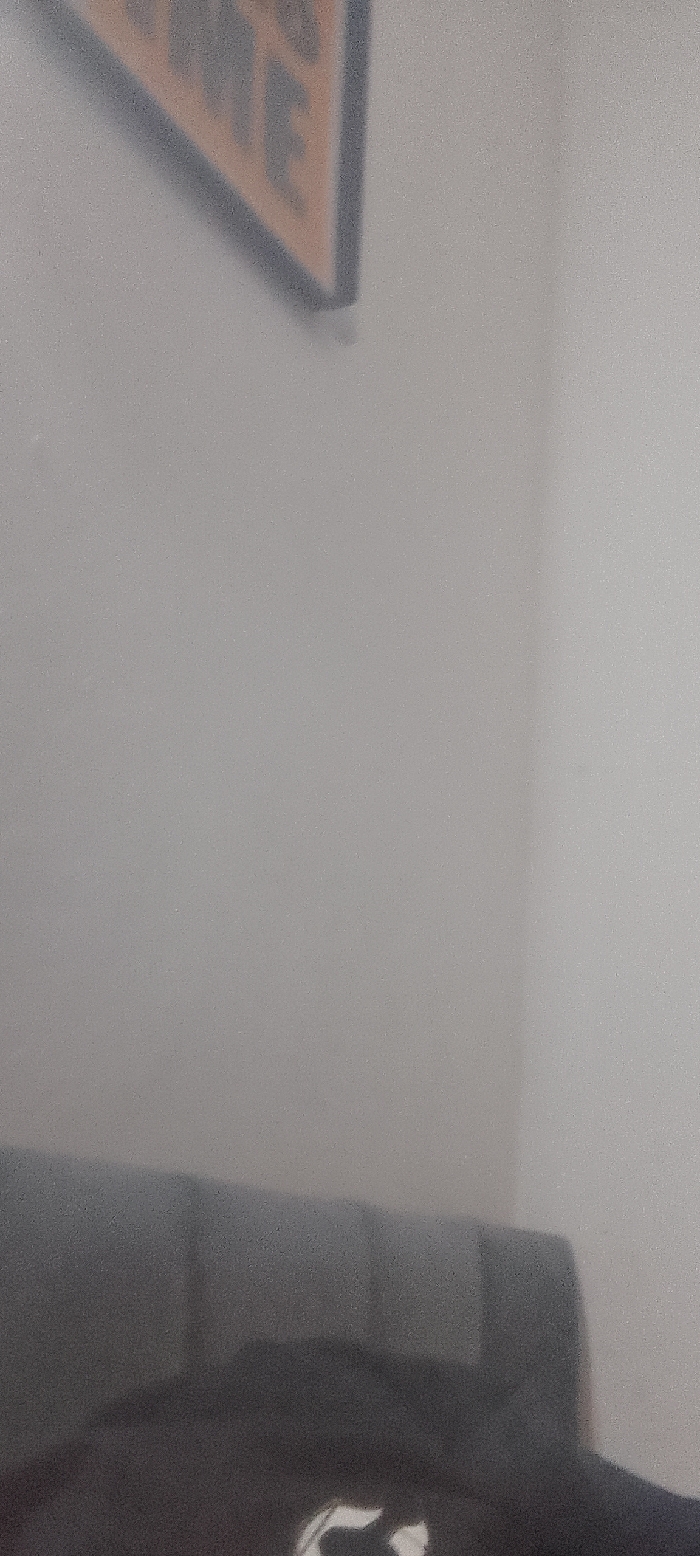 This image, captured in Idah, Nigeria, depicts an indoor scene. The dominant feature is a light grey wall, which occupies the majority of the frame. In the upper left quadrant, a blurry, rectangular object, possibly a framed sign or artwork, with a faded orange or light brown coloration and dark outlines, is mounted on the wall. A subtle vertical demarcation, possibly a corner or joint, is visible on the wall towards the right side. The lower portion of the image contains a dark-colored furniture item, consistent with a sofa, with its backrest partially visible. A small, indistinct bright white or light-colored mark, resembling a portion of a logo or design, is present on the surface of this dark furniture in the bottom-center. No individuals, discernible actions, or interactions are visible within the frame. The scene is lit by ambient light, contributing to a soft focus and granular image quality.