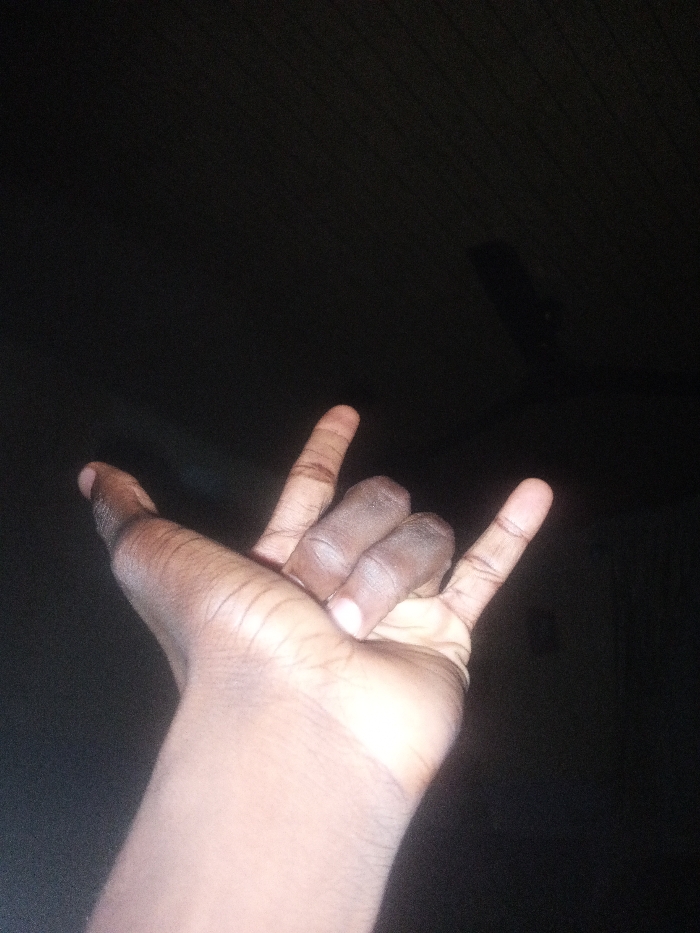 The image displays a close-up of a human left hand, exhibiting dark skin pigmentation, performing the "sign of the horns" gesture. The index finger and pinky finger are extended upwards, while the middle and ring fingers are curled into the palm, and the thumb is extended laterally. The hand is illuminated, highlighting skin creases and knuckles. The background is uniformly dark, suggesting low light conditions or a plain dark surface, with a faint, indistinct dark rectangular shape barely visible in the upper right quadrant. No other subjects or objects are distinctly identifiable. The location is Unknown, Unknown.