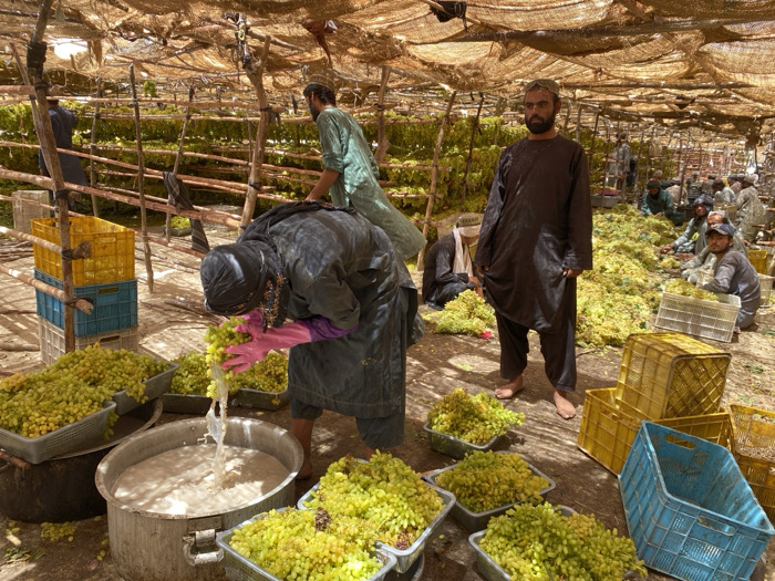 The image depicts an outdoor grape processing facility located in Bazar-e Panjva'i, Afghanistan