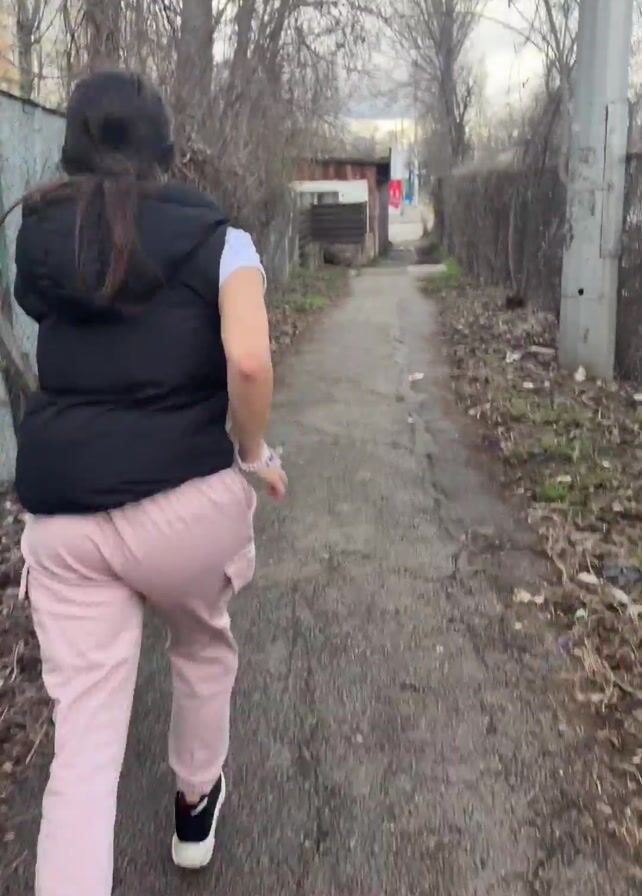 A person wearing pink pants, a white t-shirt, and a black vest, runs down a narrow path between fences. The path is lined with bare trees and undergrowth. The camera follows from behind. As the person runs, another hand in a black sleeve reaches out and grabs the person's ponytail.