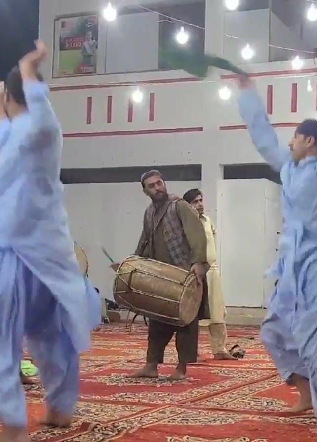 The video depicts a group of men engaged in a traditional dance outdoors at night. The dancers are dressed in traditional clothing, mostly light blue and white shalwar kameez, some also holding white cloths. They are dancing barefoot on a red patterned rug, with a drummer providing the rhythm from the center. The setting appears to be a courtyard or outdoor event space, decorated with strings of lights. A building is visible in the background with windows. A small number of people are sitting to the side, watching the performance.