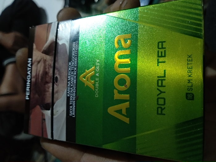 - "The image depicts a human hand holding a green pack of "Aroma ROYAL TEA" cigarettes, specifically "16 SLM KRETEK" with the "DOUBLE A OLTY" logo, in the city of Bogor, Indonesia" by FM-GX1Xl2, licensed under CC BY 4.0
