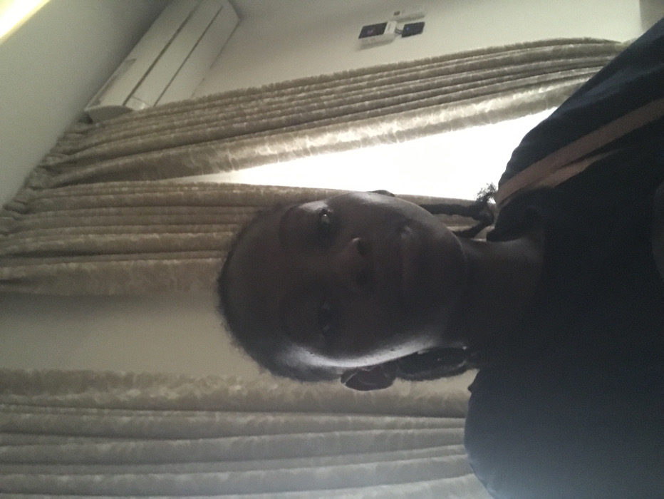 The image depicts an indoor scene in Lekki, Nigeria. A single individual with dark skin and dark hair is positioned in the foreground, capturing a selfie. The person wears a dark-colored top, with a light-colored strap visible over their right shoulder. The face is partially shadowed due to backlighting. The background features a room interior. A large window is covered by light-colored, patterned curtains, partially drawn to reveal a vertical strip of bright daylight. Above the right curtain panel, a white wall-mounted split-unit air conditioner is visible. To the right of the curtains, on a white wall, two dark, rectangular objects are mounted vertically, consistent with electrical fixtures. The ceiling is white.
