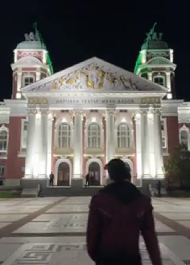A person stands in front of a large, illuminated building at night. The building has a light red façade with white columns and windows. The roofline has a gold-colored frieze and the name of the building, “НАРОДЕН ТЕАТЪР-ИВАН ВАЗОВ” is inscribed on the face of the building in Bulgarian. The building also has two smaller towers on either side. The tops of the towers are lit with green lights. The person is wearing a dark colored jacket over a black hoodie and black pants. A dark colored baseball cap sits atop the head. The person walks and poses in front of the building. The ground in front of the building is paved with a grey and white geometric pattern. Other people can be seen in the background.