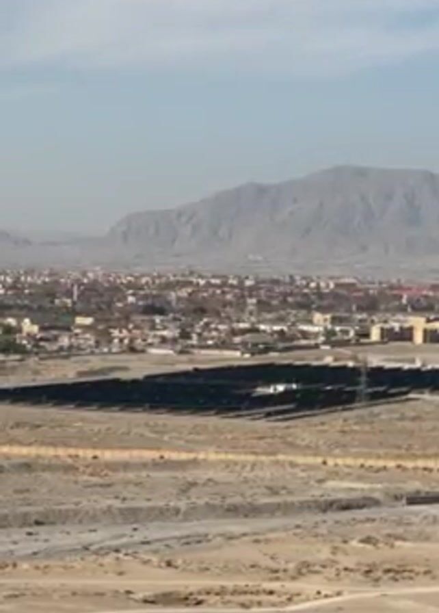 distant view of a city and a solar panel farm set in a dry, arid landscape under a bright, clear sky