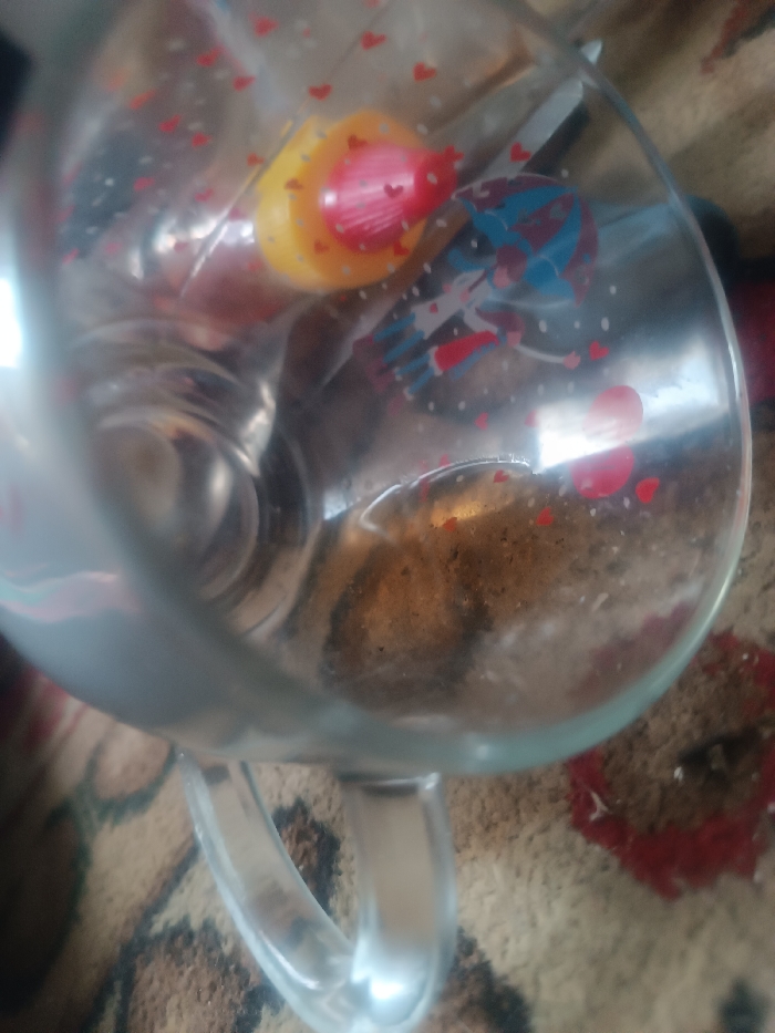 A clear glass mug is depicted from an overhead, angled perspective, showcasing its interior contents. The mug is adorned with scattered small red heart decals and a blue and red graphic illustrating two figures under an umbrella. Inside the mug, at the bottom, a brownish granular residue is present. Reflections on the glass surfaces partially obscure a yellow object with a pointed red tip and other indistinct metallic items within the mug's cavity. The mug rests on a patterned rug or carpet, which displays shades of brown and beige with subtle red designs. This scene is situated in the city of Elatan, Uzbekistan.