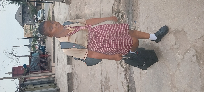 A young person wearing a school uniform is standing on a sidewalk. The uniform consists of a beige shirt, a red and white checkered skirt, and a striped tie. A backpack is slung over one shoulder. The individual is carrying a black bag. Buildings and cars can be seen in the background along a street. The sidewalk is made of concrete.