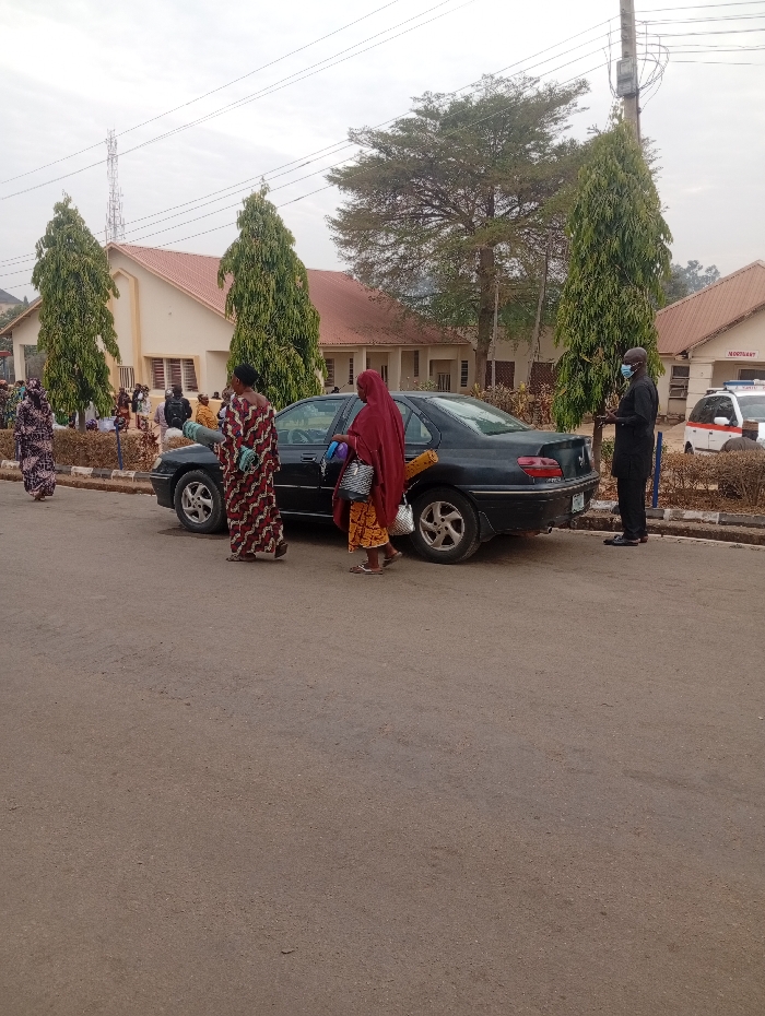 People are gathered around a black car parked on a street. Some are wearing face masks. A woman in a red headscarf and colorful dress stands near the car, holding a roll. Buildings and tall trees line the background. An ambulance is parked near a building with "NOOTLANT" visible on the sign. Overhead power lines and a utility pole are present in the scene.