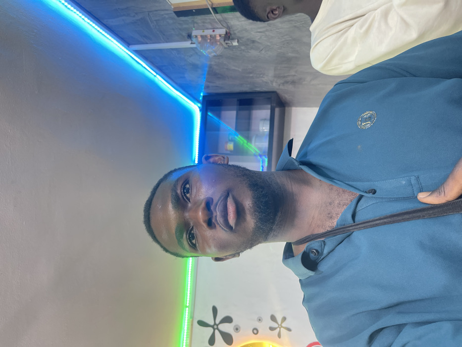 A person with a beard is wearing a blue shirt. Their head and shoulders are visible, and the shirt has a buttoned collar. Behind them, there is a wall with blue and green LED lighting. In the background, there is a display case and another person whose face is partially visible. The image appears to be taken indoors, possibly in a retail or service establishment.