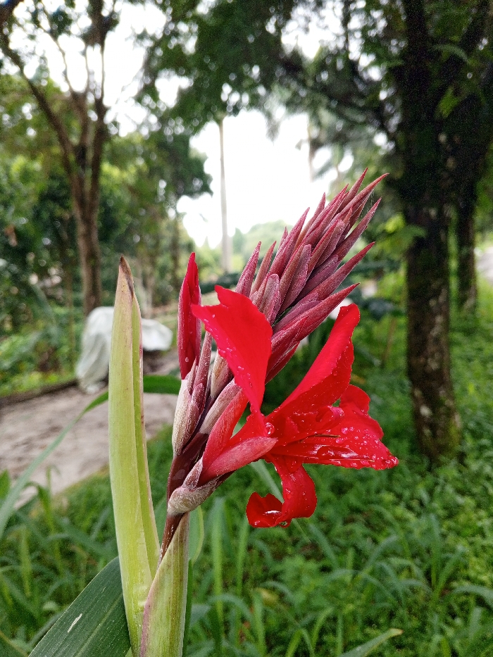 A vibrant red canna lily bursts forth, its petals catching light droplets. The flower's bud remains tightly furled, a contrast to the open bloom. A sturdy green stalk supports the flower. Lush green foliage forms a dense backdrop, speckled with sunlight and shadow. In the distance, blurred trees add depth to the serene outdoor scene.