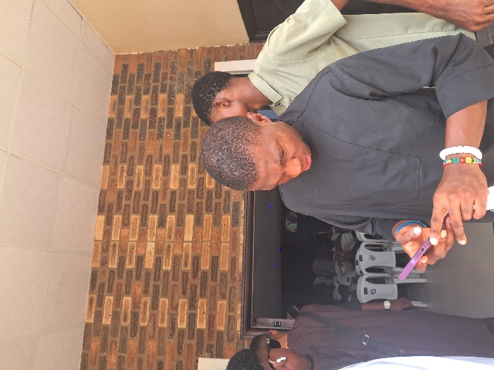 The image displays a transitional area, likely an entrance to a building, in Eziobodo, Nigeria, occupied by multiple individuals. In the foreground, a young adult male with short dark hair, wearing a black long-sleeved tunic, is focused on a purple smartphone held in both hands. He has a blue beaded bracelet on his left wrist and white and multicolored beaded bracelets on his right wrist. Behind him, to the right, another male with short dark hair is partially visible from the back, dressed in a light olive short-sleeved collared shirt. To the left, a third individual is partially visible, wearing dark sunglasses with white frame accents and a dark long-sleeved garment, with a white earpiece in their left ear. The background features a brick wall with reddish-brown and dark brown bricks arranged in a diagonal pattern, situated beneath a white suspended ceiling with a grid design. A wide, dark-framed doorway to the left leads into an interior space where rows of white plastic chairs are visible, along with several indistinct figures.