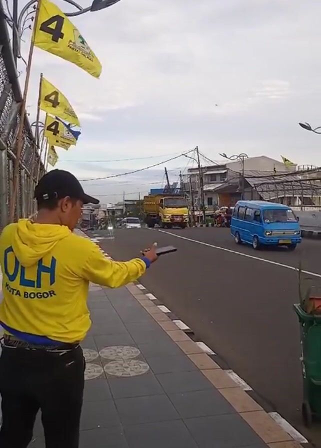 man in a yellow hooded sweatshirt with "OLH KOTA BOGOR" printed on the back, wearing a black cap and black pants, standing on a tiled sidewalk. He is holding his cell phone with both hands extended out as if he is taking a picture or video of the street. The sidewalk is next to a metal fence adorned with several yellow flags with the number 4 on them. A street with traffic is visible, including a blue van, a green and pink van, a yellow dump truck, and a few other vehicles in the distance. A green trash can sits near the edge of the sidewalk. The sky is overcast, and buildings can be seen in the background.