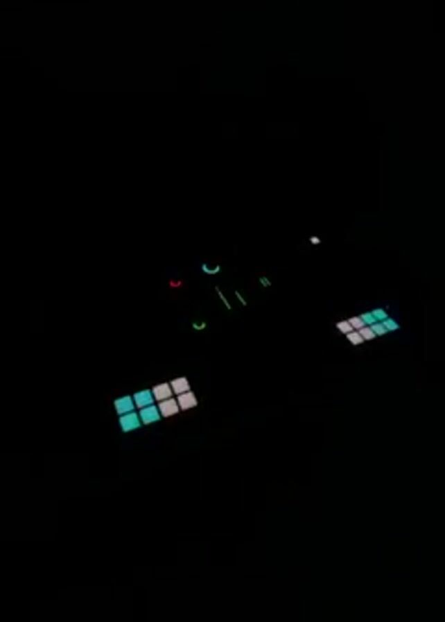 very dark room, sparsely illuminated with small, dim, irregularly-shaped light sources. These lights include small grids of squares that cycle through different colors like green, purple, and blue. There are also a few small, curved and linear lights in various colors like white, green, and red. The overall environment appears minimal and indistinct due to the limited lighting.
