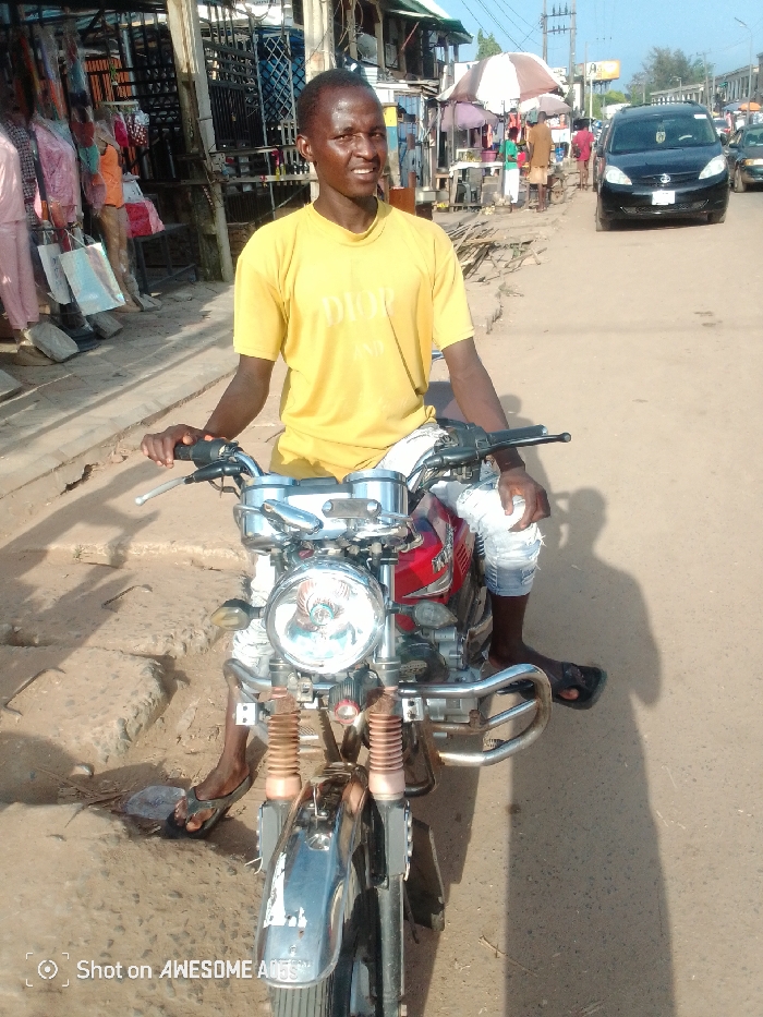 A male individual is seated astride a red and chrome standard commuter motorcycle on a street in Awka, Nigeria, under clear, sunny conditions