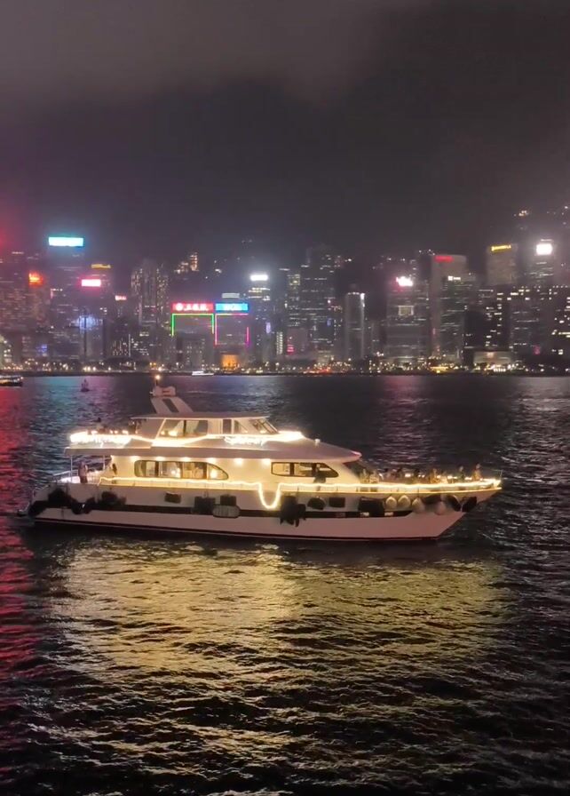 A luxury yacht, lit with white decorative lights, floats on water in front of a cityscape at night. The cityscape is brightly lit with various neon signs and building lights, their reflections shimmering on the water. The sky is dark, possibly cloudy or foggy. People can be seen on the top deck of the yacht.