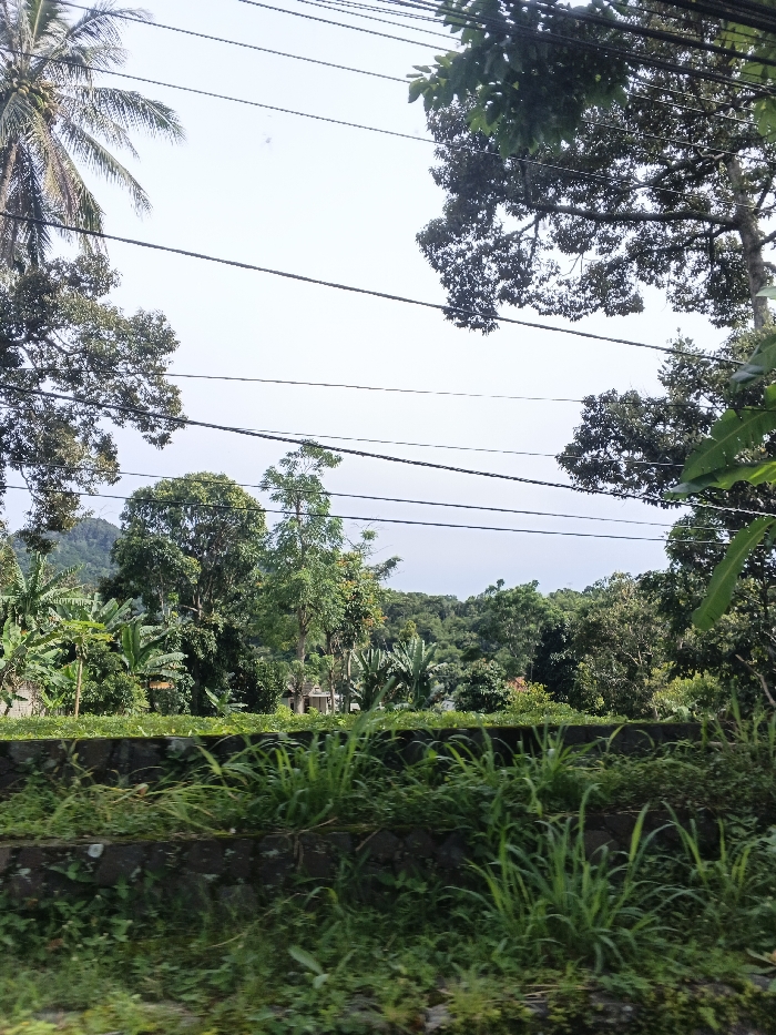 A vibrant green landscape features a mix of dense foliage, including various trees and tall grasses. Overhead, power lines stretch across the clear sky, interspersed with branches of trees. A stone wall with overgrown plants and grass divides the foreground from the background. The scene evokes a sense of lush, natural abundance.