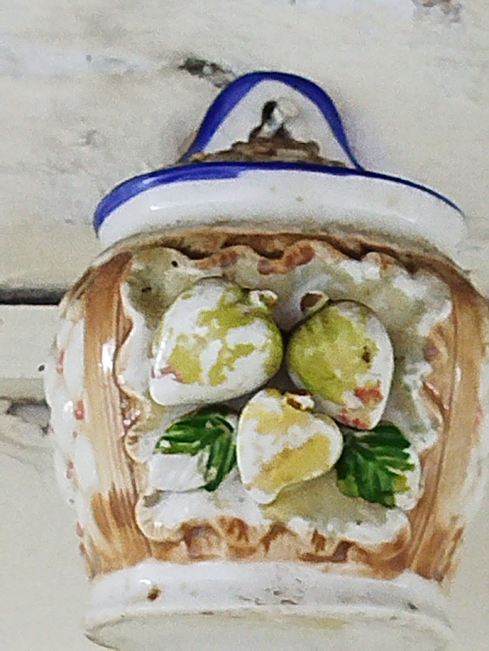 - "A ceramic wall-hanging decorative object, likely a wall pocket or small planter, is depicted in a close-up, slightly upward-angled shot" by FM-68wXo2, licensed under CC BY 4.0