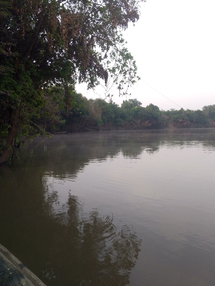 The image depicts a placid river scene located in the city of Shikaku, Nigeria