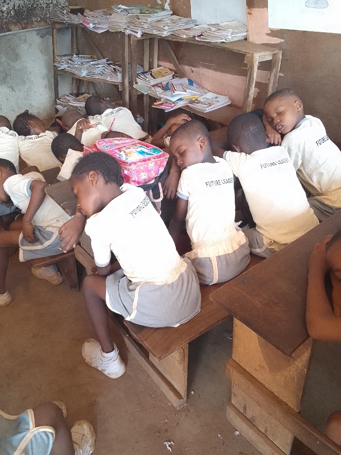 This image depicts an indoor classroom scene in the city of Unknown, Unknown, where approximately ten primary school-aged children are resting or sleeping